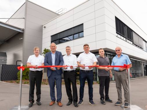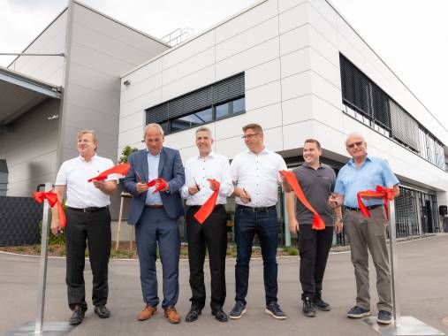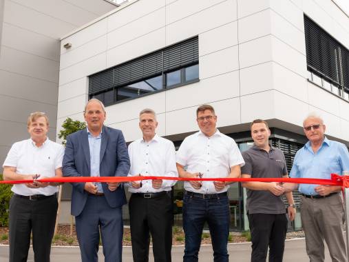 Die zeremonielle Einweihung der neuen Werkshalle: v.l. Thomas Sachers (Geschäftsführer, GRITEC GROUP GmbH), Thomas Deuschle (Oberbürgermeister der Stadt Waghäusel), Volker Knott (Werkleiter ELEMENTS, GRITEC GmbH), Oliver Grabowsky (Geschäftsführer, BREMER AG Karlsruhe), Kevin Bühler (Leiter Produktionstechnik ELEMENTS, GRITEC GmbH) und Roland Kurz (Projektleiter, GRITEC GmbH)