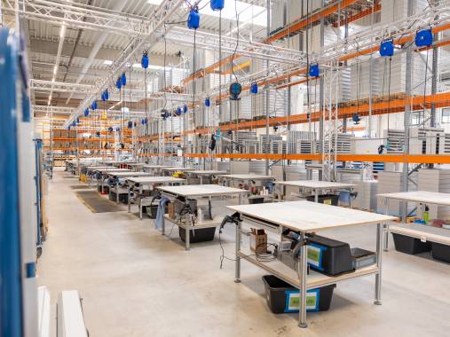 Das vollautomatisierte Palettenregal, die Stabbearbeitungszentren sowie die vollautomatisierte Stanz-Biege-Linie innerhalb des Hallenneubaus.