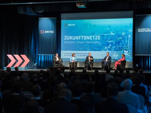 Nach der Begrüßung durch die GRITEC Geschäftsführung, vertreten durch Volker Ernst, führte die Moderatorin und Journalistin Frau Andrea Thilo durch die Podiumsdiskussion und das Programm am Vormittag. Dabei griff Sie genau die Inhalte auf, die die Brache bewegen. Im Rahmen der Podiumsdiskussion tauschten sich Andreas Hettich (Netze BW GmbH), Lukas Schuffelen (BET Energie), Anke Hüneburg (ZVEI e.v.) und Volker Ernst zum Leitthema „Zukunftsnetze – Innovativ. Smart. Nachhaltig“ aus. Es wurden vor allem die Themen Standardisierung und Skalierbarkeit sowie der Fachkräftemangel diskutiert.