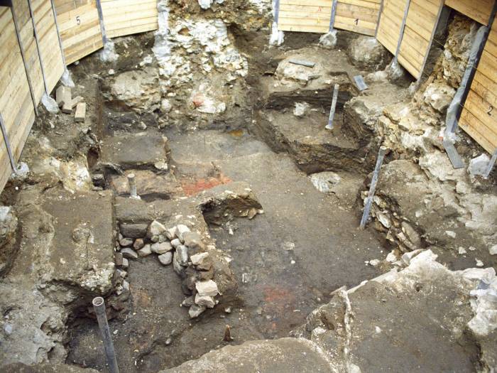 Plošný archeologický výzkum pod vedením PhDr. Jarmily Čihákové probíhal od úrovně dnešního povrchu do hloubky 4,1 m. Výkop byl prováděn v betonové vaně vybudované před zahájením výzkumu pomocí husté mikropilotáže, která umožnila provést archeologický výzkum pod hladinou podzemní vody. Do hloubky 2,4 m zabíral většinu plochy interiér domu zachycený rytinou Roelanta Saveryho. Na zbytku plochy zůstaly zachovány fragmenty dláždění a barokní zdiva a násypy. Spodní část stratigrafie byla vrcholně středověká. Na celé ploše výzkumu tehdy fungovalo ve 2. polovině 13. století výrobní zařízení interpretovatelné jako kovárna. Sestávalo z prostoru výrobního (sled pecí) a z prostoru odpadního, kam se sypal popel. Z pecí často zbyla jen propálená dna, některá s límcem z cihlářské hlíny. Rozvoj kovárny zastavila změna funkce plochy – místem byla vedena zeď, patrně hradba, jejíž základové zdivo bylo 1,5 m široké. Nejspíše se jedná o hradbu z doby opevňování Juditiny věže Jindřichem z Lipé v roce 1309. Zeď však byla téměř celá srovnána se zemí při planýrce okolního prostoru a kamenité úpravě jeho povrchu pravděpodobně v době výstavby Karlova mostu.(PhDr. Jarmila Čiháková, Archeologické oddělení NPÚ Praha, rok 1999, číslo výzkumu 8/99)