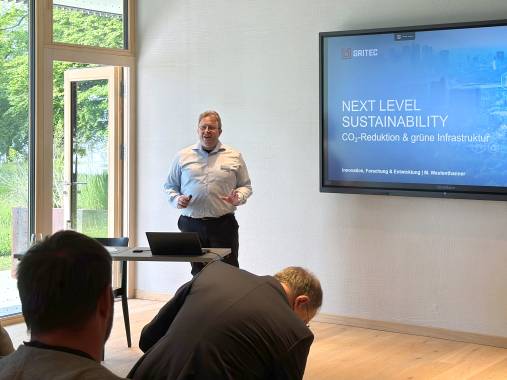 Im Anschluss präsentierte Matthias Westenthanner, Leiter Innovation, Forschung und Entwicklung bei GRITEC, „Next Level Sustainability“. Er stellte die Klimastrategie des Unternehmens vor und zeigte, wie durch ein ganzheitliches Bilanzierungs- und Monitoringsystem CO₂-Emissionen messbar und nachhaltig reduziert werden können. Seine Botschaft: Nur durch gezielten Wandel lassen sich die Zukunft bewahren.