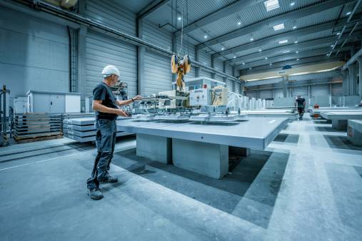 In unserer Flachproduktion fertigen wir Dächer, Zwischenböden oder auch Innenwände. Unsere GRITECer*innen stellen die Bewehrungen in den Schalungen her und arbeiten eng mit unseren Schreinern zusammen, die für die individuellen Aussparungen für Fenster und Türen verantwortlich sind. Die voll ausgestattete Tischlerei kümmert sich um alle Einschalarbeiten, damit Öffnungen und Türen auch ihren richtigen Platz bekommen.